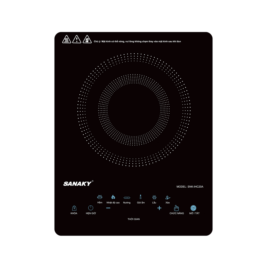 Bếp từ Sanaky này được trang bị đầy đủ hệ thống nút điều khiển cảm ứng thông minh với tiếng Việt dễ hiểu cùng nhiều chế độ nấu ăn khác nhau. Bên cạnh đó các phím bấm còn có chú thích bằng hình ảnh sẽ giúp các bạn dễ dàng làm quen và sử dụng.