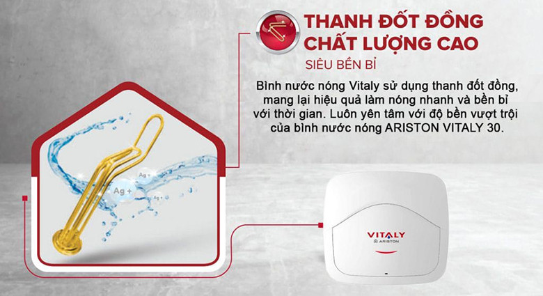 Bình nóng lạnh Ariston Vitaly 30 2.5 FE kiểu vuông sử dụng thanh đốt 100% bằng đồng thay thế các loại thanh đốt làm từ Inox và thép không gỉ trước đây. Loại thanh đốt này giúp làm nóng nước nhanh chóng, chỉ đợi từ 10 phút đã có nước nóng để sử dụng. Ngoài ra khi sử dụng bình nóng lạnh này cũng không lo bám cặn và sử dụng bền lâu.