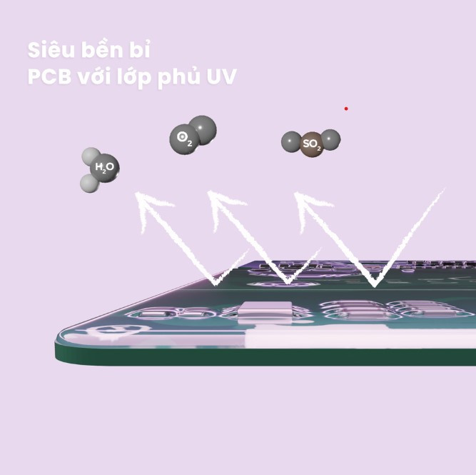 Độ ẩm trong không khí có thể tạo ra sự oxy hóa cho các linh kiện trên PCB và gây ra hiện tượng rò rỉ điện, đây là nguyên nhân chính khiến PCB dễ bị hư hỏng. Lớp phủ UV mới gấp đôi độ dày, giúp linh kiện trên PCB khó bị oxi hóa, hư hỏng mang lại độ bền cao cho máy.