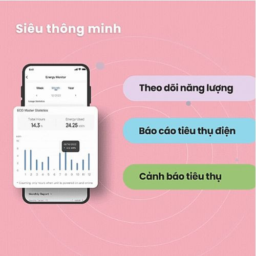 Báo cáo tiêu thụ năng lượng bao gồm thời gian kích hoạt chế độ Eco+, mức tiêu thụ năng lượng và so sánh với tháng trước.