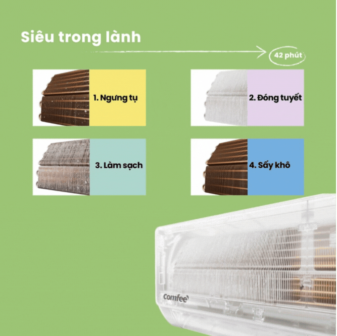 Điều hòa Comfee Inverter được nâng cấp từ chế độ rửa bằng nước (20 phút) lên chế độ làm sạch bằng băng (42 phút). Công nghệ này giúp đóng băng vi khuẩn và bụi bẩn ở -10 độ C, sau đó rã đông và làm sạch, giúp rửa trôi mọi bụi bẩn và vi khuẩn hiệu quả nhất, giữ cho làn gió luôn trong lành và an toàn cho sức khỏe.