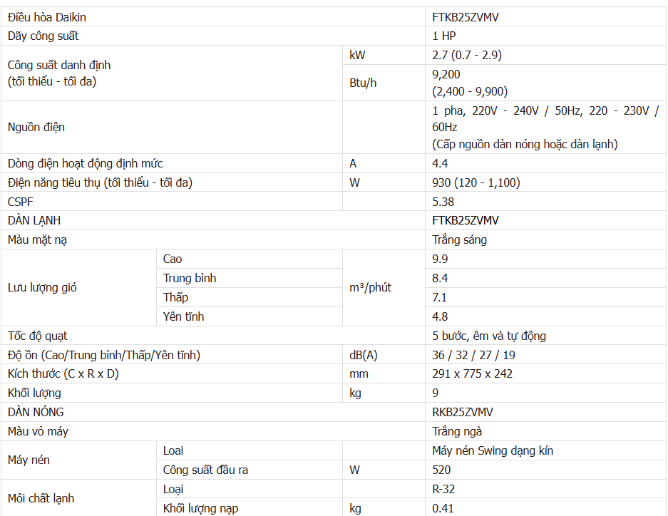 Với công suất điều hòa 9000BTU, Daikin FTKB25ZVMV phù hợp lắp đặt cho phòng diện tích dưới 15m2: Phòng ngủ, phòng làm việc, phòng họp...