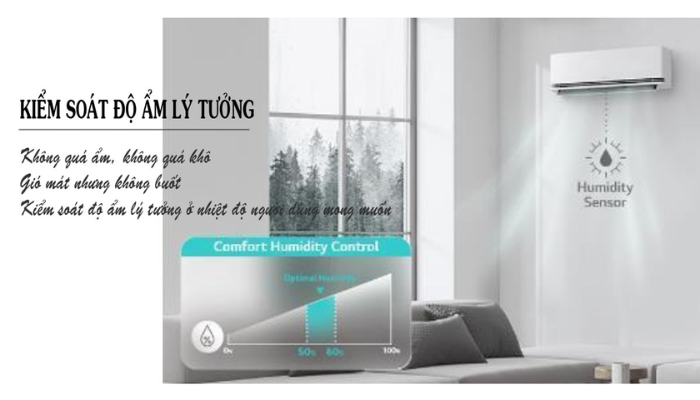 Thấu hiểu được điều đó, Điều hòa LG này đã trang bị công nghệ cân bằng độ ẩm thoải mái nhất từ 50%-60%, kiểm soát độ ẩm lý tưởng Comfort Humidity Control cân bằng độ ẩm không quá ẩm cũng không quá khô, luồng gió thổi ra mát mẻ nhưng không buốt giúp người dùng thư giãn. Kiểm soát độ ẩm ở mức độ lý tưởng khi ở nhiệt độ người dùng mong muốn.