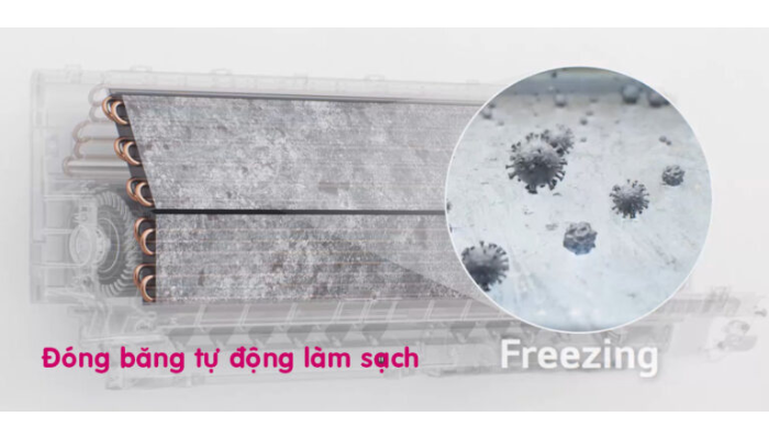 Chức năng đóng băng làm sạch qua 5 bước giúp làm sạch hoàn toàn từ trong ra ngoài, tinh lọc không khí, sử dụng băng tan để rửa trôi để loại bỏ bụi bẩn, vi khuẩn.