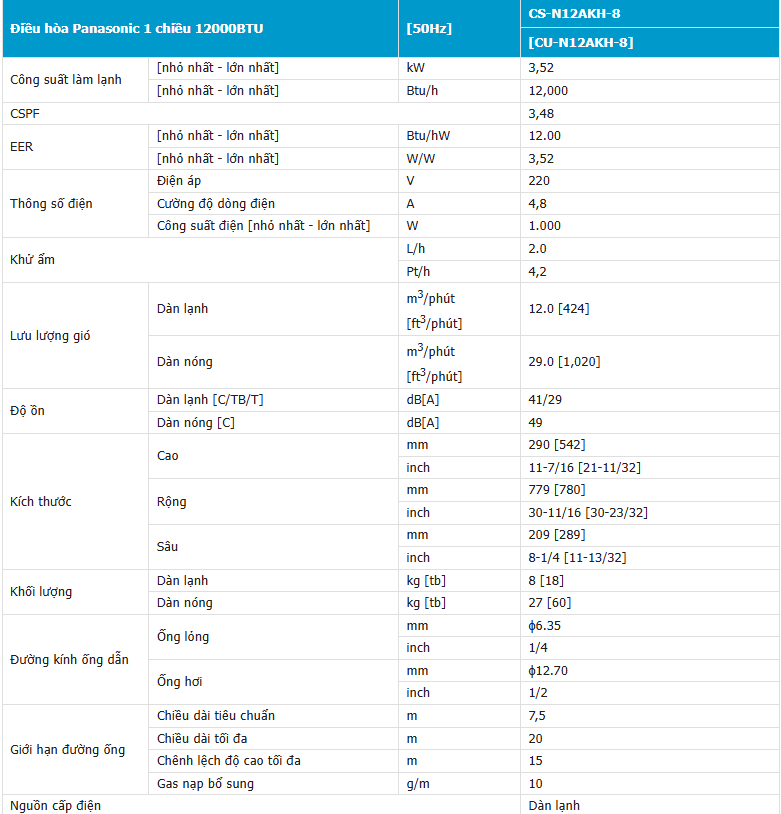 Công suất điều hòa 12000BTU (1HP), CU/CS-N12AKH-8 thích hợp lắp đặt cho diện tích phòng 15-20m2.