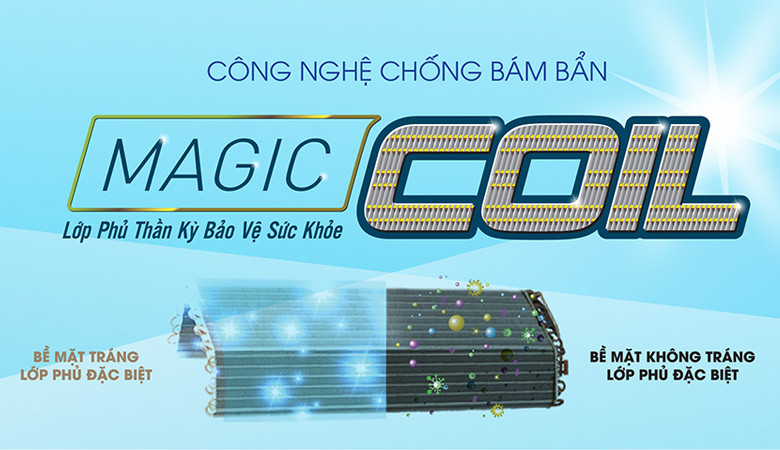 Dàn lạnh được phủ một lớp đặc biệt, hệ thống trao đổi nhiệt sẽ hấp thụ và loại bỏ hoàn toàn bụi bẩn vi khuẩn, nấm mốc, các chất bẩn này sẽ trôi theo nước thải ra ngoài. Ngoài ra công nghệ Magic Coil còn giúp tiết kiệm điện năng tối ưu, nâng cao khả năng làm lạnh nhanh, Tối ưu hóa tính năng lọc khí, giảm chi phí bảo trì và số lần vệ sinh máy.