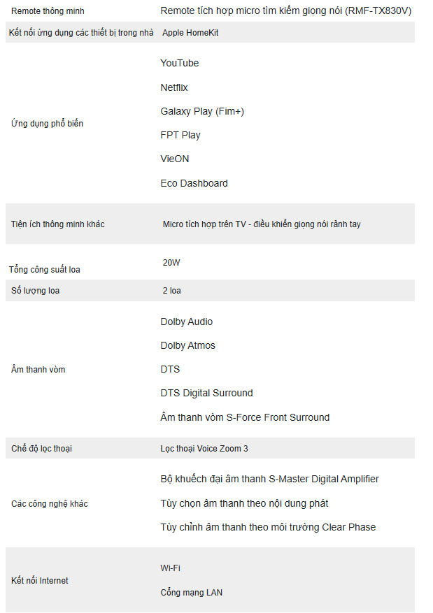 - Hệ thống loa công suất 20W mang đến chất lượng âm thanh ổn định, phù hợp với không gian sử dụng vừa phải như phòng khách nhỏ, hỗ trợ tốt cho các nhu cầu xem phim, nghe nhạc, theo dõi tin tức.