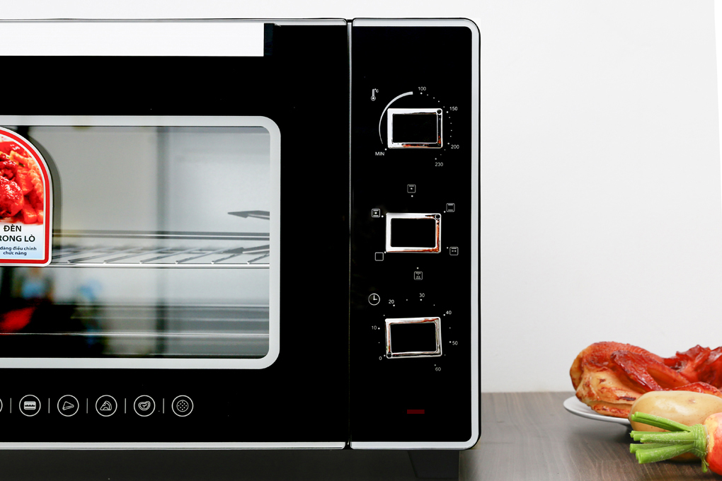 Núm ở giữa điều chỉnh chế độ nướng như: Thanh nhiệt trên/dưới kết hợp quạt đối lưu, thanh nhiệt trên kết hợp quạt đối lưu, thanh nhiệt trên/ dưới, thanh nhiệt trên kết hợp xiên quay, thanh nhiệt trên/ dưới kết hợp xiên quay và quạt đối lưu, tắt.