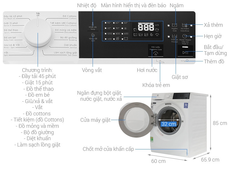 | Tiện ích | Xả thêm Vệ sinh lồng giặt Thêm quần áo khi máy đang giặt Ngâm Khóa trẻ em Hẹn giờ giặt kết thúc Giặt sơ Chỉnh số vòng vắt Chỉnh nhiệt độ nước Hygienic Care - Diệt khuẩn sau mỗi lần giặt |