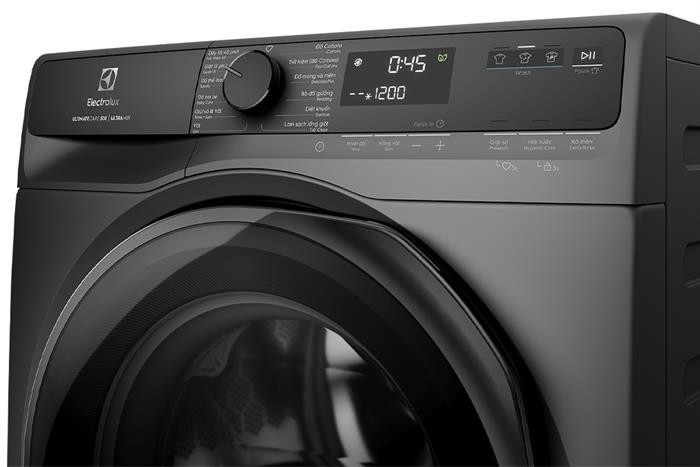 Tiện ích Hygienic Care (Diệt khuẩn hơi nước), Extra Rinse (Xả thêm), Delay End (Trì hoãn kết thúc), Prewash (Giặt sơ), Soak (Ngâm), Pause (Dừng để thêm quần áo), Khóa trẻ em, Finish In (Hoàn thành vào lúc), Soil level (Chỉnh mức độ bẩn quần áo)