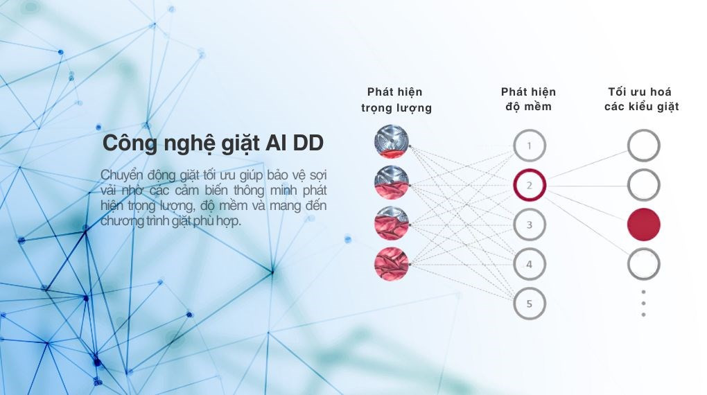 - Công nghệ AI DD bảo vệ sợi vải là sử dụng trí tuệ nhân tạo AI được trang bị trong máy giặt để đo lường trọng lượng, cảm biến độ cứng, mềm của vải để tối ưu hoá bằng các chương trình hoạt động chuyên biệt.