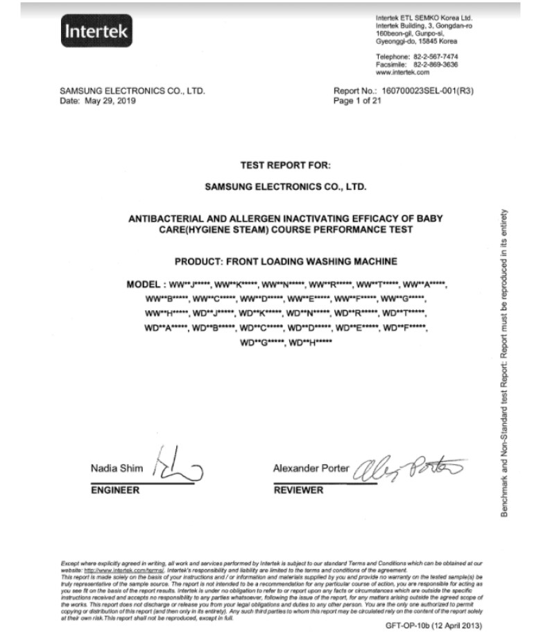 Công nghệ giặt hơi nước Hygiene Steam trên máy giặt Samsung được Intertek công nhận có thể diệt khuẩn 99,9%, ngừa dị ứng.