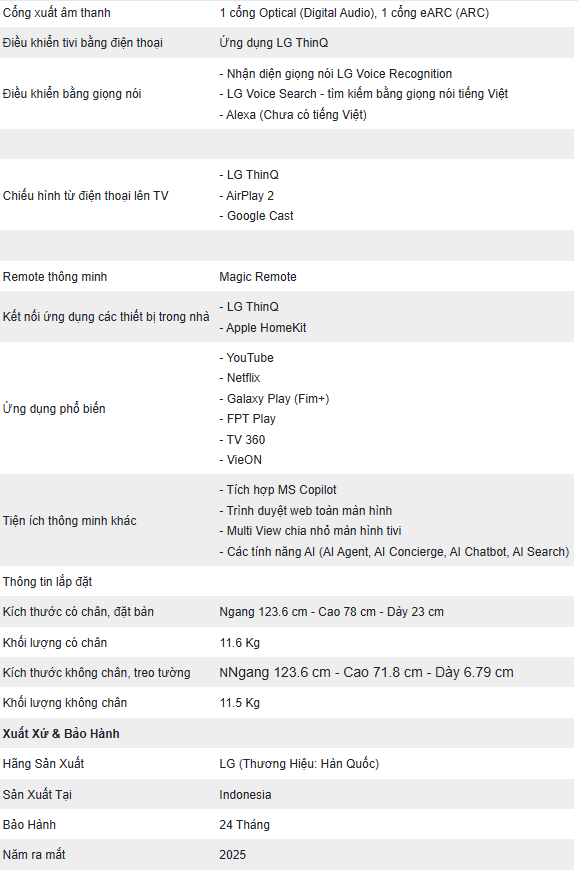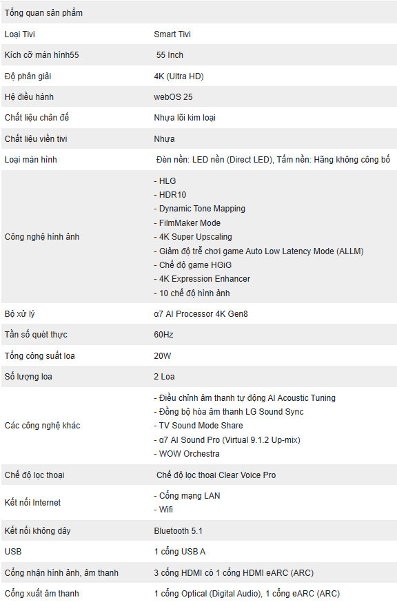 Với những ưu điểm vượt trội về thiết kế tinh tế, công nghệ hình ảnh 4K sắc nét được hỗ trợ bởi bộ xử lý α7 AI 4K Gen8 mạnh mẽ và công nghệ 4K Super Upscaling, cùng với trải nghiệm âm thanh vòm ảo ấn tượng từ AI Sound Pro, Smart Tivi LG 4K 55 Inch 55UA8450PSA thực sự là một lựa chọn đáng cân nhắc cho mọi gia đình.