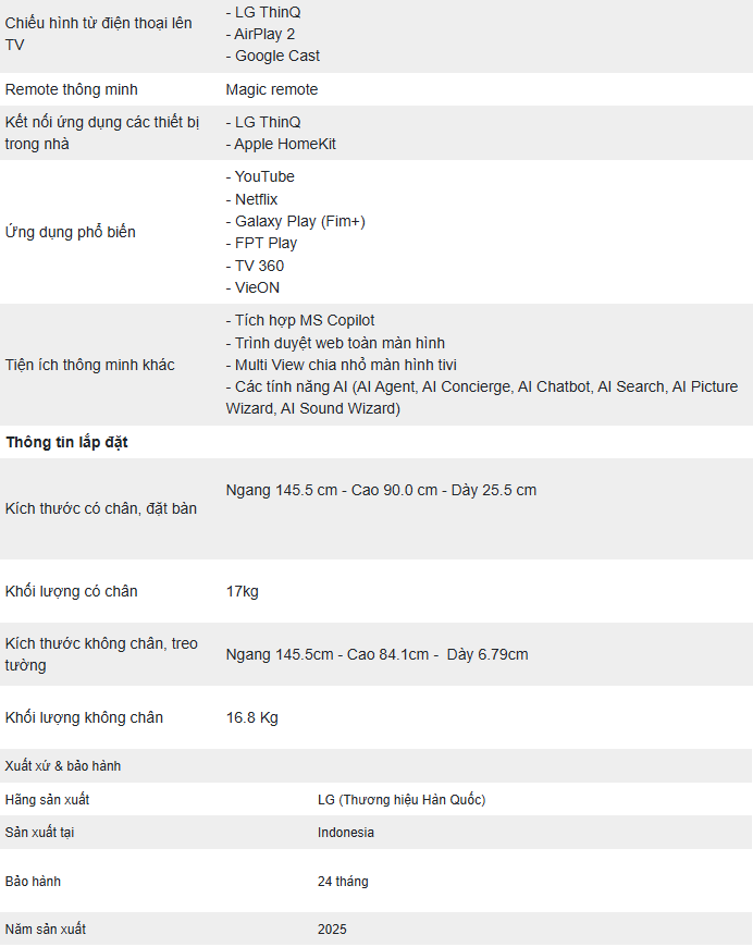 Bên cạnh đó công nghệ AI Acoustic Turning thông minh tự động điều chỉnh âm thanh dựa trên nội dung, đảm bảo lời thoại rõ ràng, hiệu ứng âm thanh sống động và âm nhạc mạnh mẽ giúp bạn hoàn toàn đắm chìm vào thế giới giải trí.