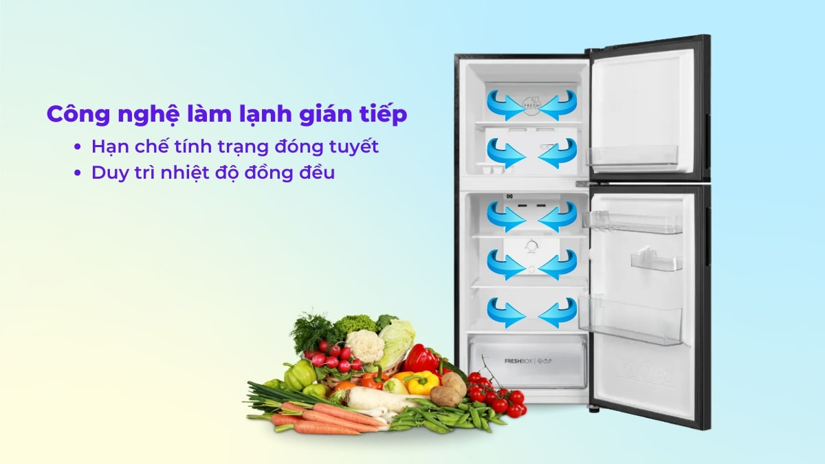 Ở những chiếc tủ lạnh thế hệ cũ, tình trạng đóng tuyết diễn ra khá thường xuyên do hệ thống làm lạnh không đều. Với tủ lạnh Aqua Inverter 189 lít AQR-T220FA(FB), tình trạng này đã được giải quyết nhờ công nghệ làm lạnh gián tiếp. Quạt sẽ thổi hơi lạnh ra cửa sau đó mới truyền đến các ngăn tủ, vì vậy hơi lạnh lan tỏa đều hơn và không làm cho thực phẩm ở gần dàn lạnh bị đóng tuyết.