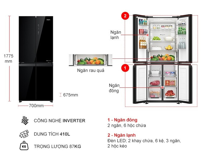 - Với dung tích ngăn lạnh 264 lít, bên trong tủ lạnh Aqua gồm nhiều khay, kệ và ngăn đựng thực phẩm tươi giúp người dùng dễ dàng phân bổ, lưu trữ thực phẩm theo nhu cầu của các thành viên trong gia đình.