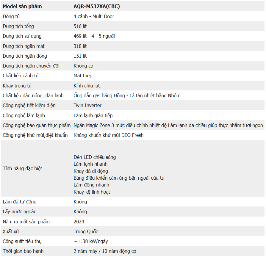 Tủ lạnh Aqua Inverter 469 lít AQR-M532XA(CBC) sử dụng thiết kế Multi Door thích hợp gia đình từ 4 - 5 thành viên. Tủ lạnh này còn có khả năng khử mùi hôi và hạn chế vi khuẩn với công nghệ H-DEO Fresh, tiết kiệm điện năng tối ưu với công nghệ Twin Inverter, công nghệ làm lạnh đa chiều mang khí lạnh đến mọi ngóc ngách trong tủ giúp cho việc lưu trữ thực phẩm của gia đình bạn thoải mái hơn, dễ dàng hơn.