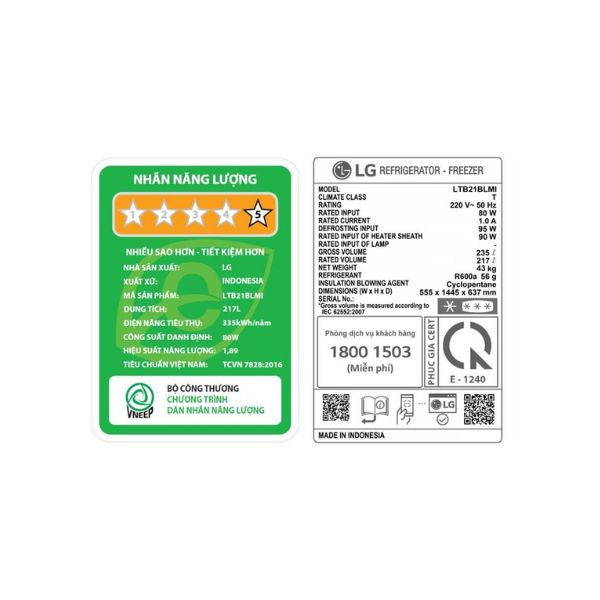 | Công suất tiêu thụ công bố theo TCVN | 335 kWh/năm |