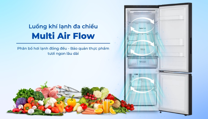 Tủ Lạnh LG Inverter 335 Lít LBB33BLGA có khả năng tạo ra luồng khí lạnh đa chiều Multi Air Flow, phân phối đều đến mọi ngăn lưu trữ. Nhờ đó dù cho người dùng đặt ở vị trí nào thì thực phẩm vẫn được làm lạnh hiệu quả để duy trì trạng thái tươi ngon lâu dài.