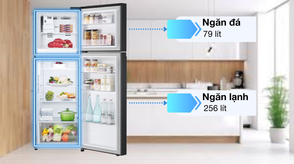 - Dung tích ngăn lạnh 256 lít, dễ dàng lưu trữ nhiều loại thực phẩm sử dụng thường xuyên như rau củ, trái cây, đồ uống.