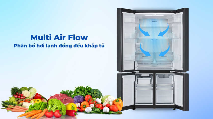 - Tủ lạnh LG LFD58BLGA được trang bị công nghệ luồng khí lạnh đa chiều Multi Air Flow, giúp hơi lạnh phân bổ đều khắp các ngăn tủ. Điều này không chỉ tăng cường khả năng làm lạnh nhanh chóng và hiệu quả mà còn giúp bảo quản thực phẩm tươi ngon lâu hơn, đồng thời hạn chế tình trạng đóng tuyết, đảm bảo vệ sinh và tiện lợi trong quá trình sử dụng.