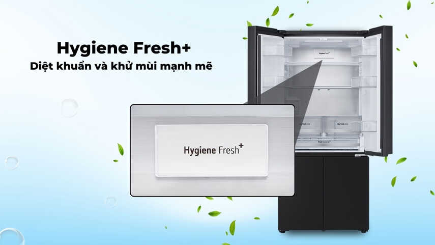 Tủ lạnh LG Inverter 571 lít Multi Door LFD58BLGA được trang bị bộ lọc Hygiene Fresh+™, giúp diệt khuẩn và khử mùi mạnh mẽ. Luồng không khí đi qua bộ lọc này sẽ giữ cho không gian bên trong tủ lạnh luôn sạch sẽ và trong lành. Quá trình khử khuẩn liên tục giúp bảo vệ thực phẩm, ngăn ngừa hư hỏng và thối rữa, đảm bảo thực phẩm luôn tươi ngon và an toàn. Điều này giúp người dùng yên tâm lưu trữ nguyên liệu cho các bữa ăn chất lượng và dinh dưỡng cho gia đình.
