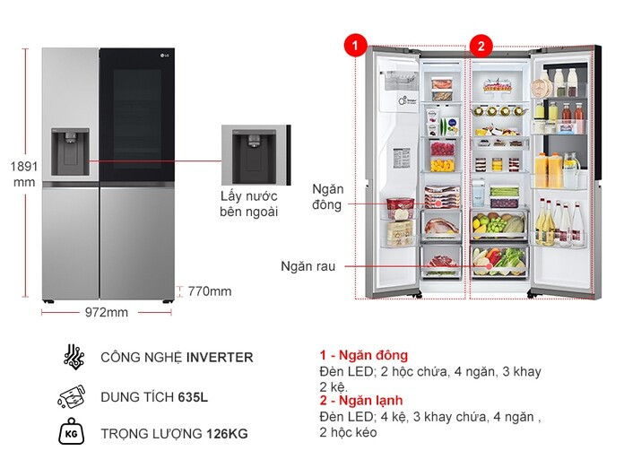 - Với dung tích sử dụng 635 lít, sản phẩm đáp ứng nhu cầu lưu trữ thực phẩm trong gia đình có trên 5 người hoặc phục vụ cho mục đích kinh doanh quán ăn, nhà hàng.