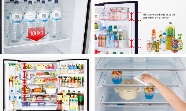 Tủ lạnh Mitsubishi Electric Inverter 580 lít MR-LA72ER-GBK có hệ thống ngăn chứa bằng khay kính chịu lực chống trầy xước. Khay kính có khả năng chịu lực tới 100kg giúp bạn dễ dàng lưu trữ thực phẩm đã chế biến trong nồi, chảo nặng mà không cần lo lắng. Chiều cao của khay có thể điều chỉnh để chứa nồi với kích thước lớn hoặc chứa chai nước 2L.