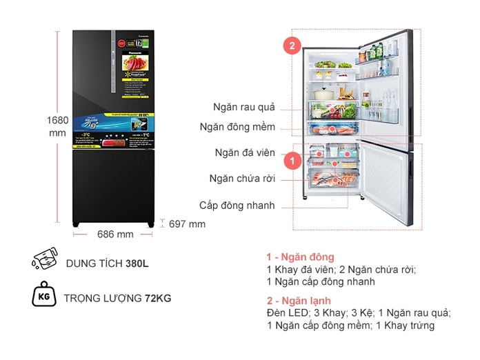 Tủ lạnh Panasonic Inverter NR-BX421WGKV có dung tích sử dụng lên đến 380 lít, trong đó ngăn lạnh dung tích 308 lít, ngăn đá dung tích 112 lít - Đáp ứng nhu cầu dự trữ thực phẩm cho gia đình trong nhiều ngày, tiết kiệm thời gian đi mua sắm.