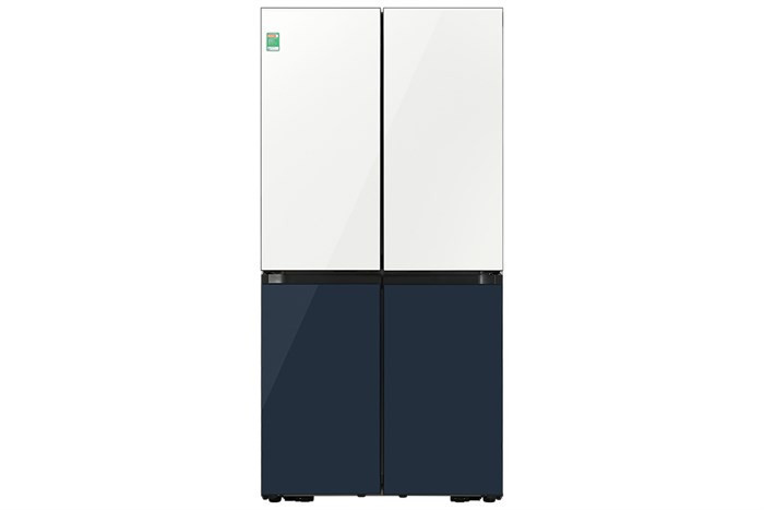 Tủ lạnh Samsung Inverter 599 lít RF60A91R177/SV có thiết kế 4 cửa kiểu Pháp sang trọng, kết hợp với mặt kính Glam Glass đầy tinh tế cùng tông màu trắng - xanh Navy hiện đại tạo điểm nhấn cho không gian bếp.
