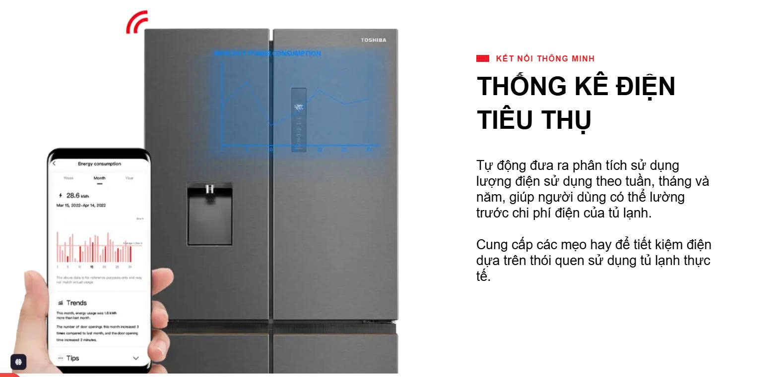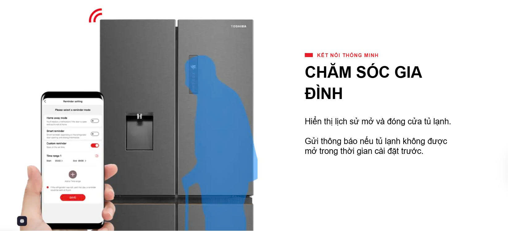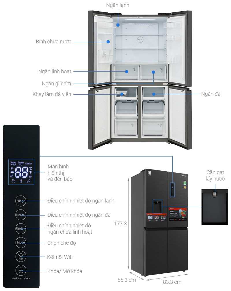 | Tiện ích | Khay đá di động Cảnh báo mở cửa Bảng điều khiển cảm ứng bên ngoài cửa tủ Điều khiển từ xa trên ứng dụng TSmartLife Cảnh báo quên đóng cửa tủ trên ứng dụng Khay kệ linh hoạt |