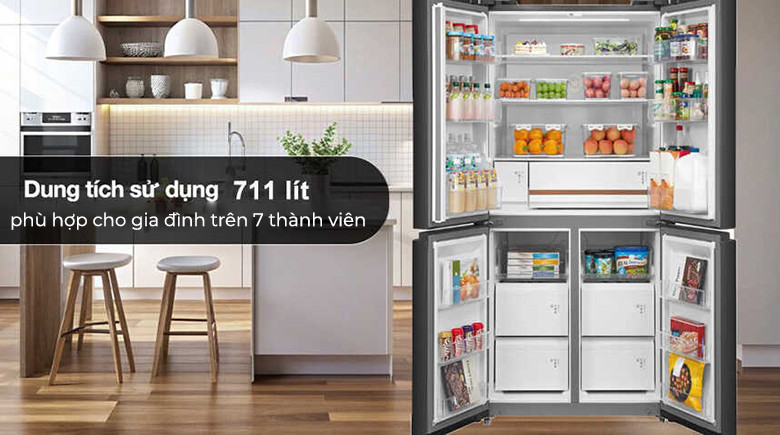 Tủ lạnh Toshiba GR-RF895WIA-PGV(22)-XK sở hữu dung tích sử dụng lên đến 711 lít phù hợp cho những gia đình có từ 7 thành viên trở lên hoặc những ai có nhu cầu lưu trữ thực phẩm với số lượng lớn. Không gian bên trong tủ lạnh được thiết kế thông minh với nhiều ngăn chứa riêng biệt, giúp bạn dễ dàng phân loại thực phẩm một cách gọn gàng và tiện lợi. Đồng thời, thiết kế này cũng tối ưu khả năng bảo quản tươi ngon cho từng loại thực phẩm, giữ cho thực phẩm luôn tươi ngon lâu dài.